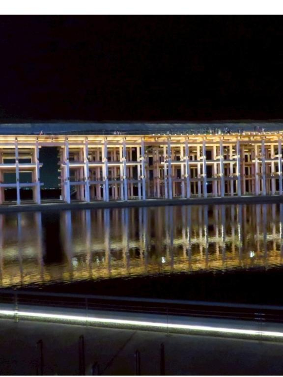 夜の大屋根リング夜の万博で水辺に反射して神々しくみえる