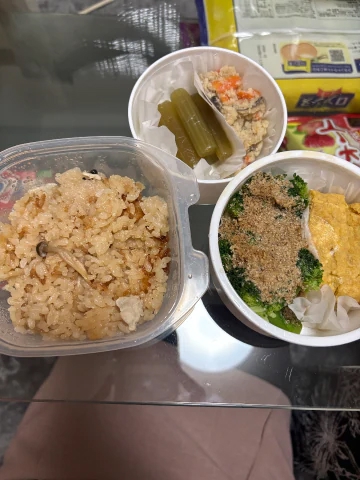 むね肉としめじの炊き込みご飯と卵焼き、ブロッコリー、フキの煮付け、おからimg