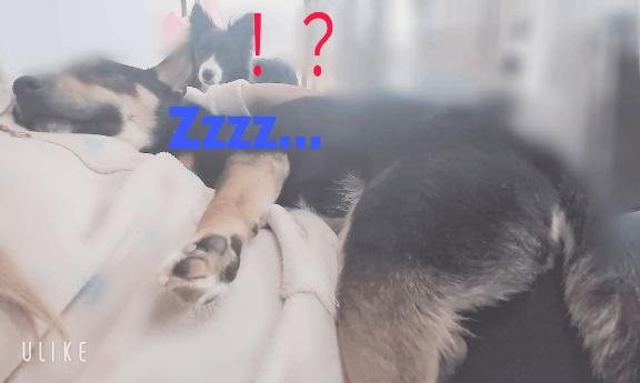 ボーダーコリーの方はまだ赤ちゃんだから柴犬が寝てたら近くに来て「ワンッ」って泣いたり部屋中を走り回ったりするだけどそんなのお構いなし?