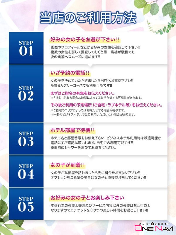 - ・お客様には女性が到着するまでに必ずお風呂、シャワー等を浴びてお待ち頂きます。