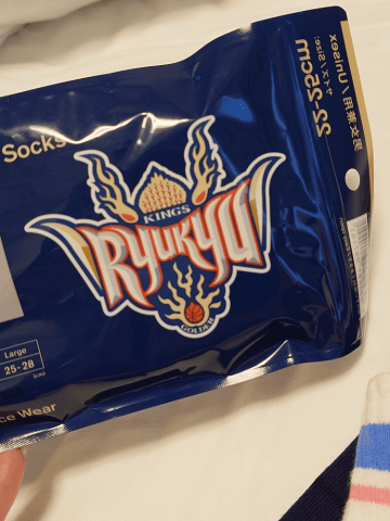 ファミマのソックスは石垣島で買ったんだけど、よく見たらRyukyuって書いてあってバスケットボールのマークがあるから、バスケットボールとコラボなのかな?
