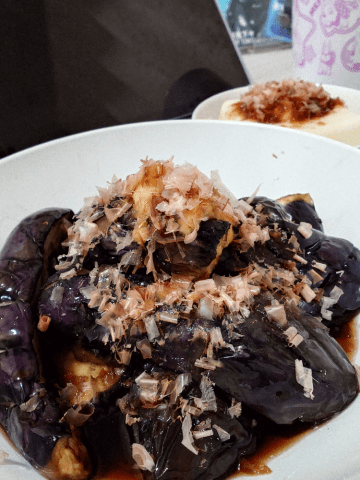 帰宅してジムに行って、ナスの煮びたしと冷奴に熱々のそば茶。