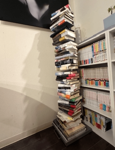 見づらいですが積み重ねる型の本棚はハード本専用、奥のは実は三台本棚を並べていてそのうち二台の下段は文庫で埋まっております
