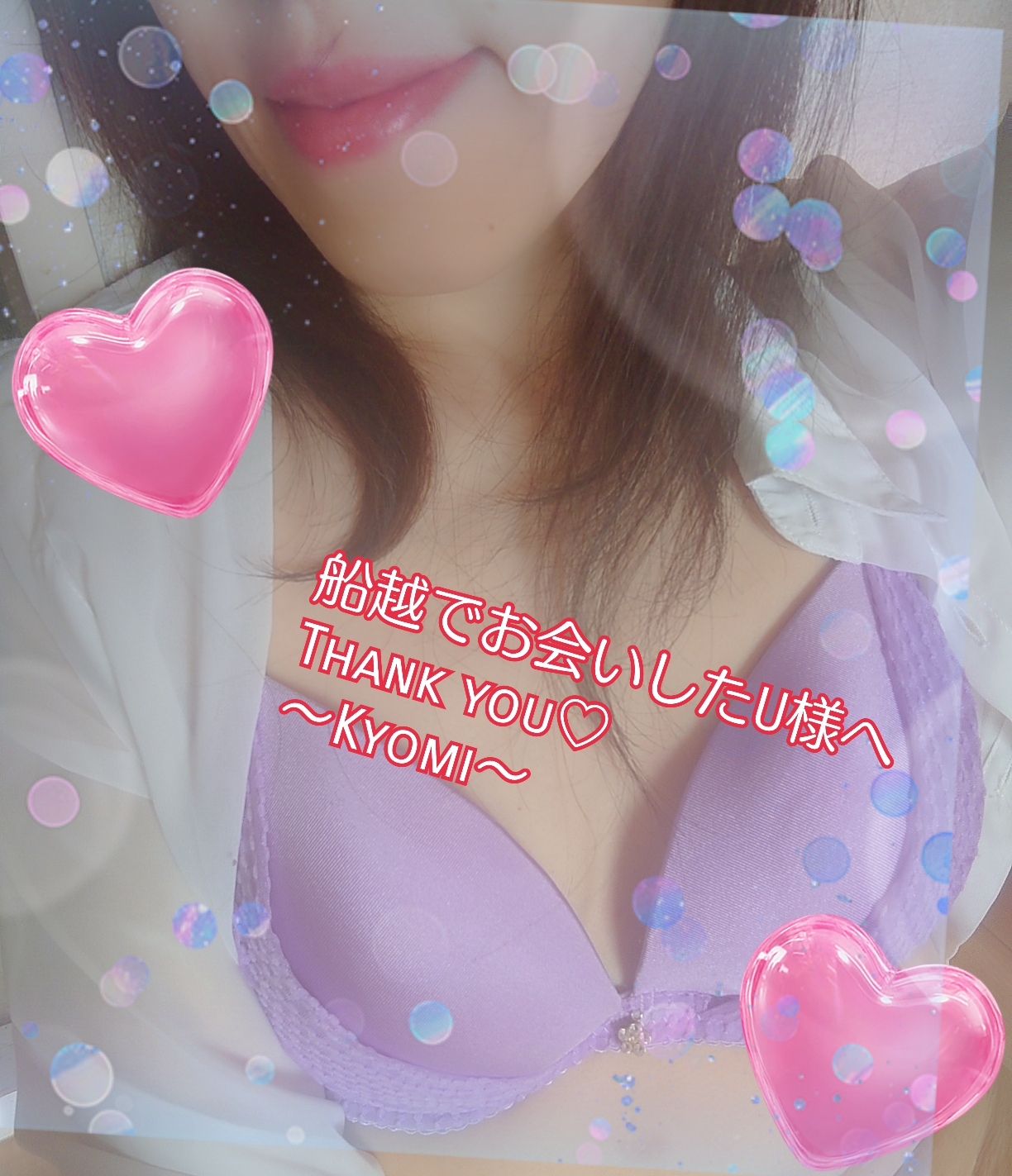 船越でお会いしたU様へ今日はデートのお誘い、ありがとうございました🥰湯船で一緒にポカポカ、気持ちよかったですね♡先に私の方を触って下さって…正直照れて照れて大変でした(>⩊<)♡仕事柄というのもあって湯船でポカポカできた分たくさん首周りほぐせて嬉しかったです♪全身〜のシャワーでウフンな場所見つけちゃったから、素敵な表情独り占めしちゃった♡お別れが名残りおしかったけどピッカピカの笑顔を見れてとっても嬉しかったよ!また笑顔で会えるん楽しみにしとっとよ♡〜京美〜