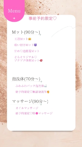 たくさんの方法で気持ちよく♡♱⋰ ⋱✮⋰ ⋱♱⋰ ⋱✮⋰ ⋱♱⋰ ⋱✮⋰ ⋱♱⋰こんにちわー!さらはぬるぬるもオイルマッサージも得意なので分かりやすくメニューにしちゃいました