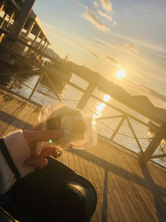 海に浮かぶ初日の出を眺めながらのコンビニおにぎり。