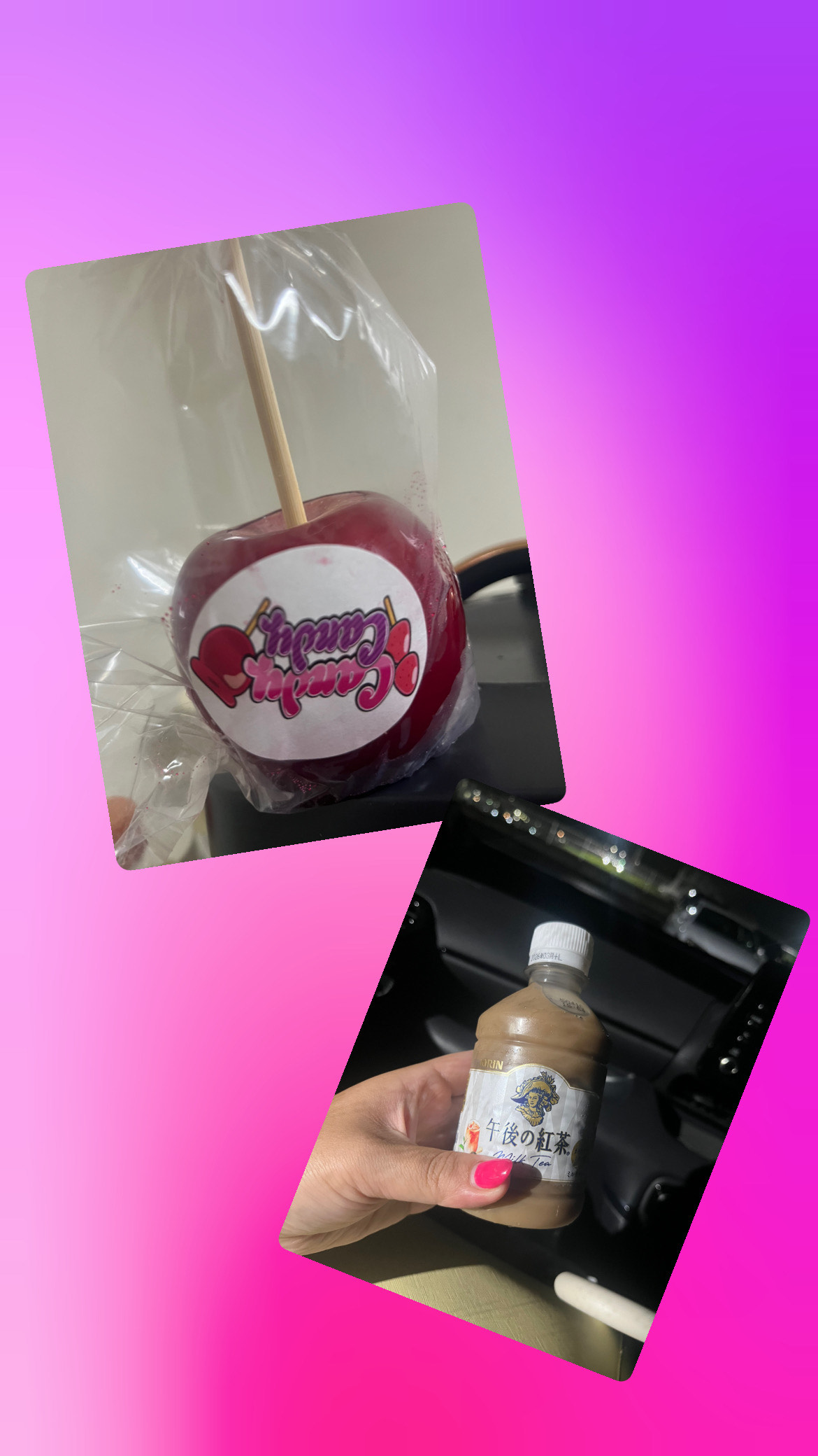 あまぁーいやっと´Д`)ヤット‥ずっと食べたかったりんご飴買えた〜🫰なんなら、おまけでいちご飴もくれて最高に幸せ💞画像のミルクティーはリピさんが土曜日買ってくれたやつ!このサイズのミルクティーいっちゃん好きです🤟最近好きな物買えたり貰えたりで幸せすぎる( ´˘` )
